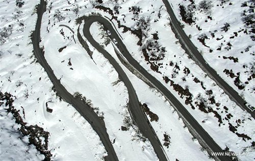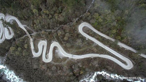 Photo taken on March 30, 2017 shows the aerial view of Medog highway in southwest China's Tibet Autonomous Region. The highway linking Medog, the last roadless county in China, with its neighboring Bome county in Tibet was formally opened to traffic on Oct. 31, 2013, ending the county's isolation from the outside world. (Xinhua/Purbu Zhaxi)